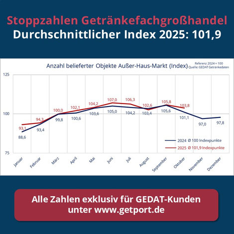 Der Getränkefachgroßhandel im Außer-Haus-Markt verzeichnet im Oktober 2025 einen Indexwert von 103,8. Bezugsgröße ist das Gesamtjahr 2024 mit einem Index = 100. Dies entspricht einem Rückgang um -1,9 % im Vergleich zum Vormonat September 2025. Im Vergleich zum Vorjahresmonat ergibt sich ein Zuwachs von +2,7 %. Nach den Anstiegen im September 2025 zeigt sich im Oktober bei allen drei Betriebsformen eine rückläufige bzw. stagnierende Entwicklung. Im Vergleich zum Vorjahresmonat verzeichnen lediglich die Betriebsformen Speisebetriebe und Beherbergung Zuwächse.